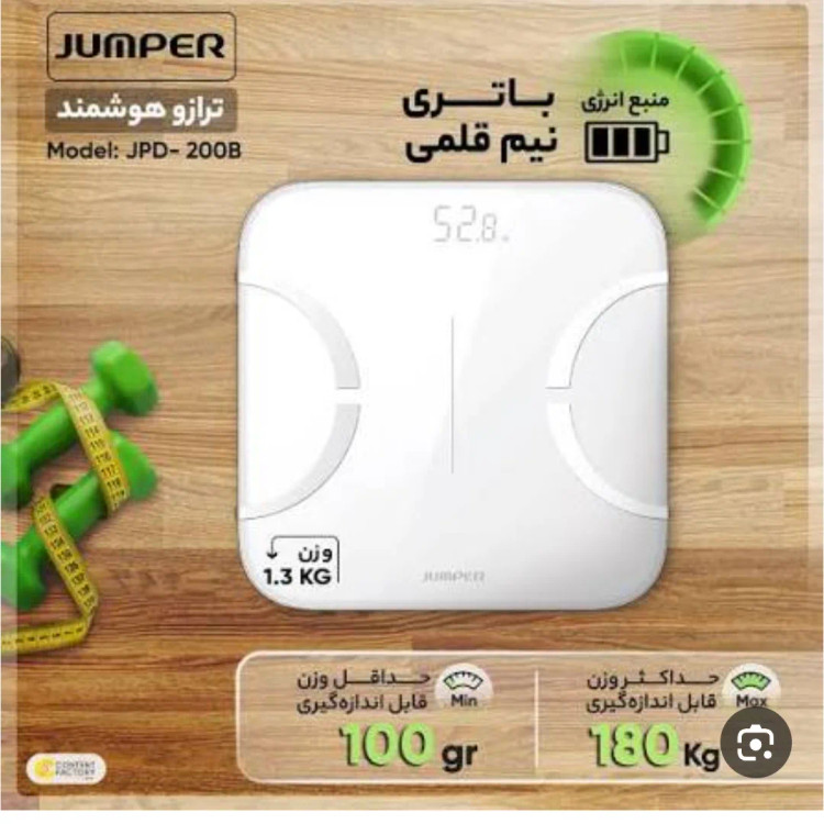 ترازوی هوشمند Jumper مدل JPD-BFS200A با طراحی بسیار زیبا و مدرن از جدیدترین تکنولوژی روز برای اندازهگیری شاخصهای آنالیز بدن شامل درصد عضله، درصد رطوبت بدن، وزن استخوانها، میزان سوخت و ساز پایه، شاخص چربی احشایی، سن بیولوژیک، میزان چربی بدن، میزان پروتئین بدن، شاخص تودهی بدنیBMI ، درصد چربی زیر پوستی، و وزن بهره میبرد. این ترازوی آنالیزور بدن مجهز به بلوتوث است که میتواند این شاخصهای اندازهگیری شده را به اپلیکیشن موبایل(هم اندروید هم IOS ) ارسال کند و شاخص های سلامتی خود را در زمانی مشخص زیر نظر داشته و تحلیل کنید. از مزیت های این ترازو …
